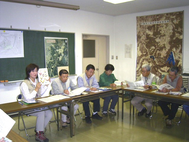 タネを運ぶ工夫やしくみについて熱心に討議する指導員 |
