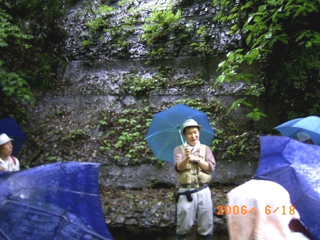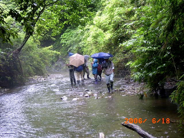 | 小雨が降ったり止んだりの蒸し暑いカエル日和の日曜日。梅が瀬渓谷で、タゴガエルの生態を観察する「フィールドミュージアム研修会」が講師に県立中央博物館の大木淳一氏をお招きして開かれた。梅が瀬渓谷でのタゴガエル観察研修会は毎年開かれ、今回で4回目である。今年生まれたばかりの子ガエル、去年生まれた子ガエル、大人の大きさのカエルという三世代のタゴガエルとの出会いを期待し、今回は時期を少しずらし開催された。 建物や展示物が無くても、自然そのものを資料として活用する新しい形の博物館活動「フィールドミュージアム研修会」。かわいいタゴガエルの赤ちゃんを観察しながら、タゴガエルが生息できるこの素晴しい渓谷の環境維持・保全についても考えさせられた「フィールドミュージアム研修会」であった。 |