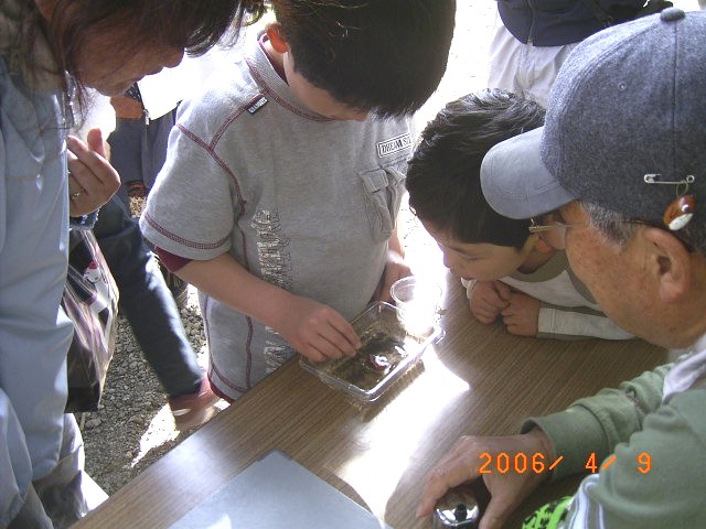 栗の実のお玉でオタマジャクシすくいを楽しみ、 カップレンズで観察する |
