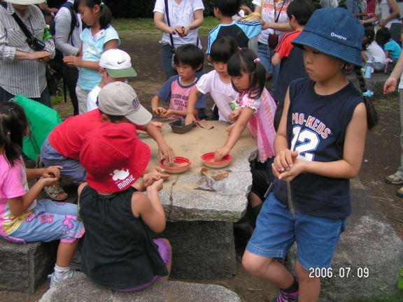 関東ローム層から ドロダンゴ用の赤土を採取する参加者の子供さんたち |