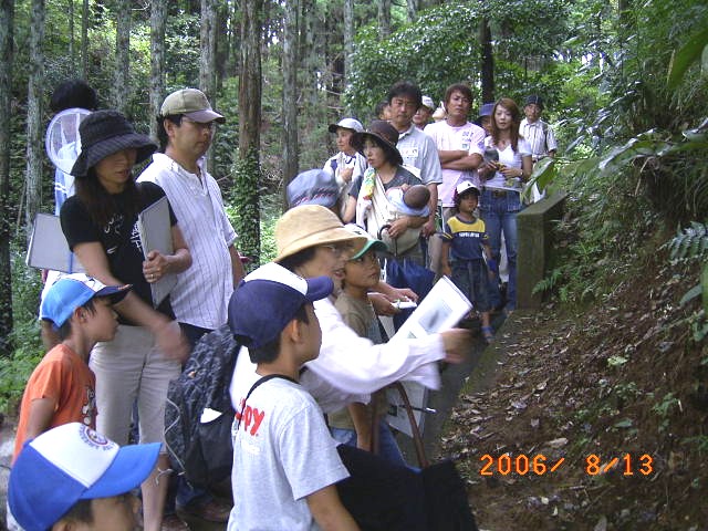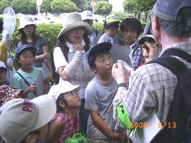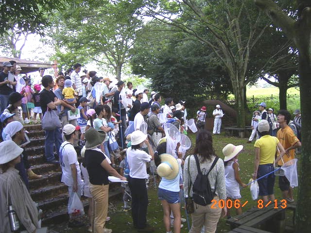 | 夏休み中でもあり、テーマも「夏の森の昆虫探し」と子どもさん向けのため、非常に多くの子どもさんと保護者の方々が参加してくださった。しかし、観察会開始後しばらくして雨が降り始め、次第に激しくなり雷雨となる可能性が高くなった為、急遽観察会を中止した。参加者の皆様には大変申し訳なかったが、幸い全員無事帰路についていただいた。 | |