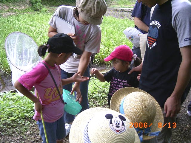 オニヤンマについて指導員の説明を聴きながら 熱心に観察する子どもさんたち |