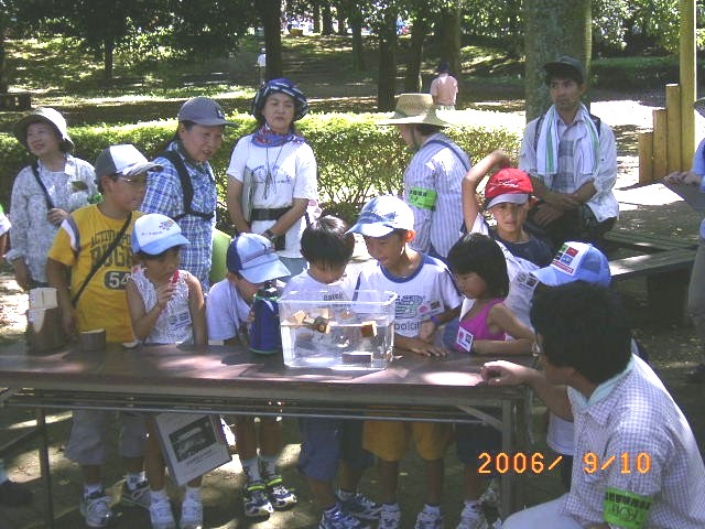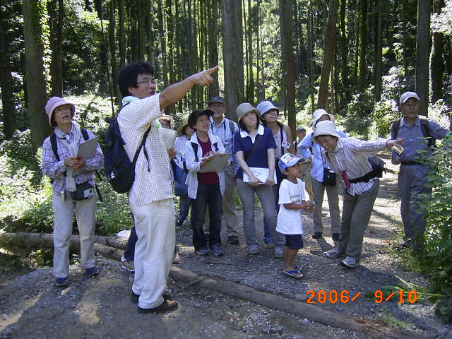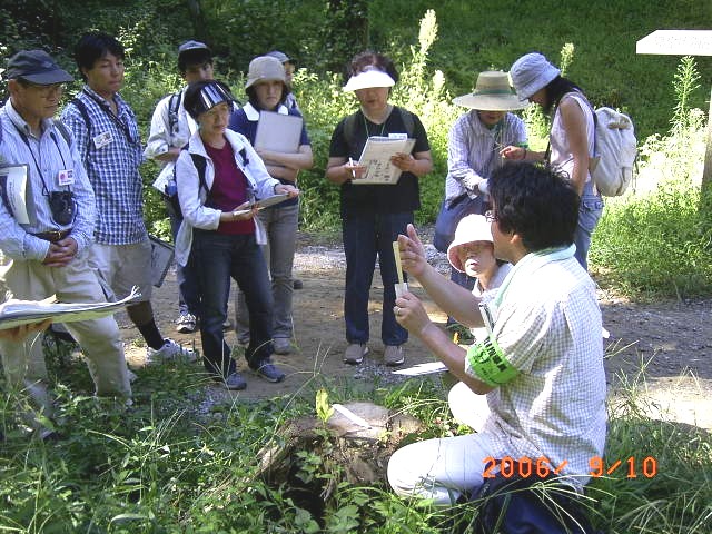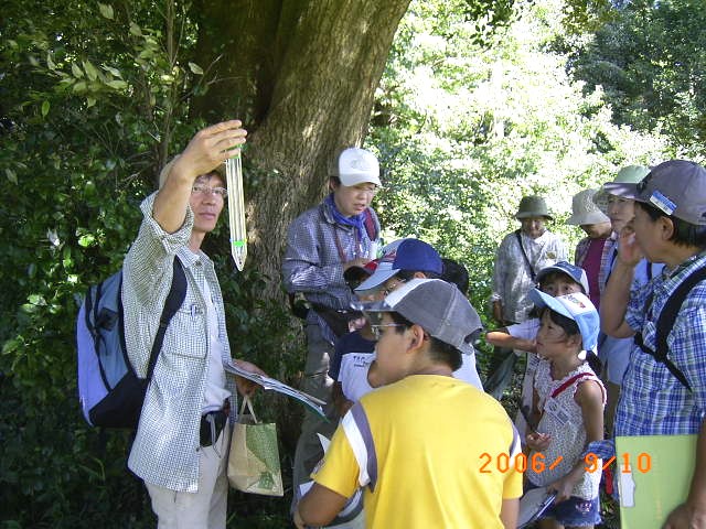 チョッキリムシと落とされたドングリ付き枝葉 についての説明に聴き入る |