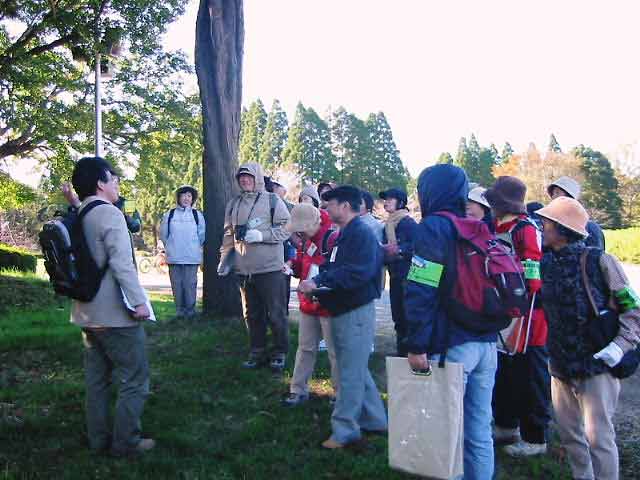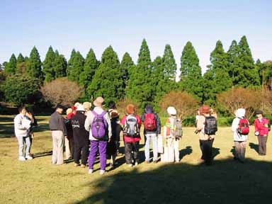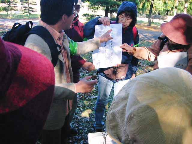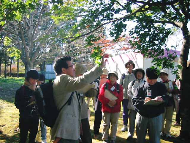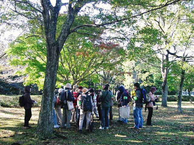 | 木枯らしが吹きすさむ中、晩秋の昭和の森の自然を観察しながら、万葉集、日本書紀、随筆、俳句等、日本を代表する文学の中に自然がどのように詠まれてきたのかを追体験しました。参加した皆さんは、改めて、昔の日本人の繊細さと、万葉集の頃の日本人と現代人の自然観の違いに驚き、感心している様子でした。 | |