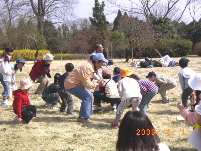 カエルグループの発表の後は全員で蛙飛び 最初はアマガエル!それ ぴょん!ぴょん! |