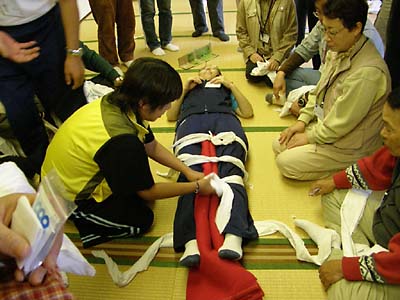 104 日赤・応急処置 三角巾大腿部骨折処置実演 |