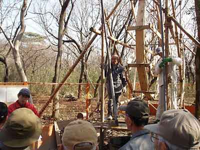 | 上総掘りのスタ−トは10月頃からということですが、なかなか人数が集まらなくて続けてやるのが大変そうでした。 はじめ小橋さんから簡単な説明がありました。ちょっとしたパンフレットもいただきました。上総掘りの道具に関しては、こうしなくてはいけない、というものではなく、素人が身近にある材料を使って独自の工夫をするところにも面白さがあるとか。 つづけてできれば早く水を含んだ砂層まで届くので、週1回くらい、どうぞ助っ人をやろうという方、来てください!毎土曜とプラス5人くらい集まる水・木曜にやれたら、ということです。 連絡・問い合わせ先: 小橋一民 電話0430−2770−3279 |
