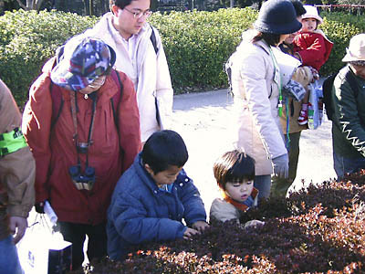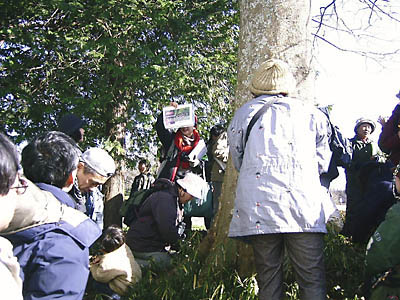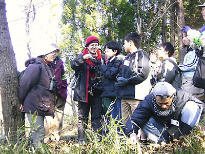 海の小石のそのように 川原のすきに だあまって 夜がくるまで沈んでる 春のくるまで かくれてる 昼のお星は眼に見えぬ 強いその根は眼に見えぬ 見えぬけれどもあるんだよ 見えぬけれどもあるんだよ 見えぬものでもあるんだよ 見えぬものでもあるんだよ (金子みすず「星とたんぽぽ」より) 観察会に先立ち「星とたんぽぽ」をみんなで朗読し、担当指導員 より今日の観察会のねらいの説明を受ける |