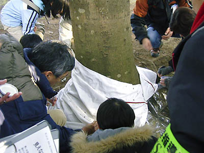 ![]() ワラを解くといろんな生きものが樹の根元に落ちてくる |