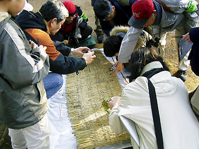 ![]() 広げたワラについている虫など観察し、ワラを巻き元に戻す |