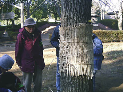 ![]() 虫探しワラ巻き作戦! 今日の観察会のために昨秋準備したワラ巻き |