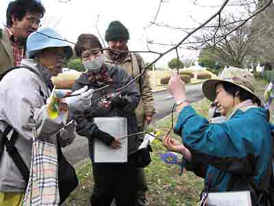 朝から生憎の雨模様なので屋内で指導員の研修を行いました。担当指導員の作った資料から昭和の森の春を感じる 項目の解説を聞き、午後からの一般観察会への準備を行いました。春の鳥、ウグイスの鳴き声を吹く竹笛と春風の動きを見つける風車を作る実技訓練も行いました。午後の観察会は晴れ間が出て来ましたが、参加者は集まらず担当者をハラハラさせましたが、貴重な2名の参加者と共に「どこかで春を・・・」の観察を行いました。 公園の中ではあちらこちらに春を感じる現象が観られ、参加者から驚きと喜びの声を聞く事が出来ました。 春は駆け足で近づいて来ており、異常気象の中で動植物も大きく変化をして来ていました。 (撮影 須田聰恵) |