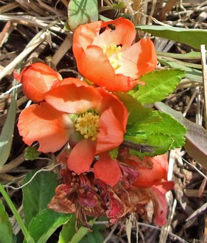 草の間に顔を出している小さな 「バラ科のクサボケ(草木瓜)」 |