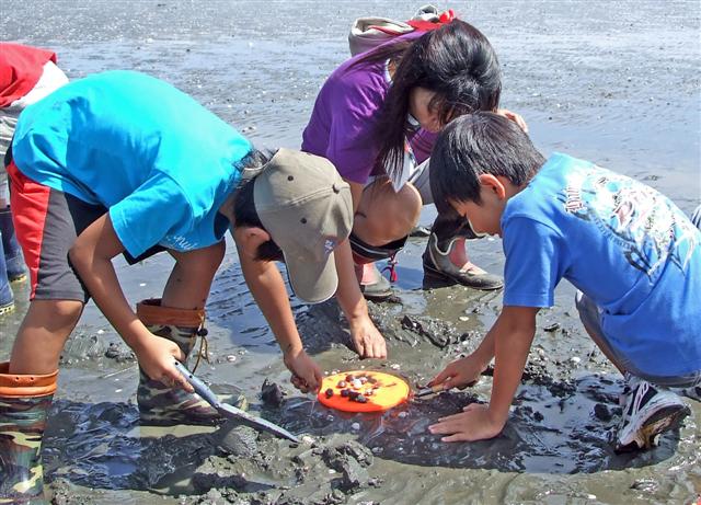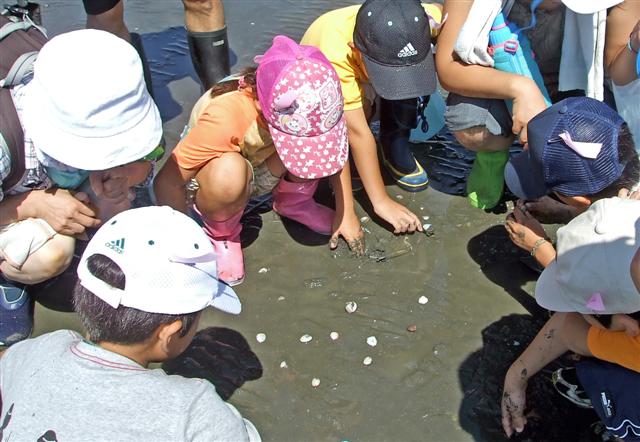 | 夏休み明けの最初の日曜日、三番瀬は元気な子どもたちの賑やかな声でいっぱいになりました。5グループに分かれ、「干潟であそぼう」カードに書かれた6つの体験を順次行い、できたらシールを貼るという形で進めていきました。しかし、台風直後の干潟は、川の泥水と土砂が流れ込み、生き物たちにいつもの元気がありません。三番瀬の生き物が置かれている厳しい一面を見せつけられました。それでも、子どもたちは、たくさんの生き物を探し出し、「発見」の喜びと「何だろう?」を繰り返し、目を輝かせていました。 ヤドカリや小さなカニ、貝、ハゼ・・・、台風の中、生き残ったたくましい干潟の生き物たちガンバレ! |