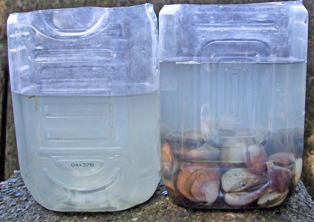 二枚貝の海水浄化実験、あまり元気のない貝さん |