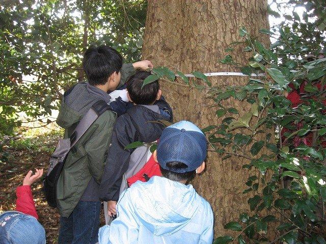 木の高さの計測 みんな片目をつむって真剣!「23mかな〜?」 |