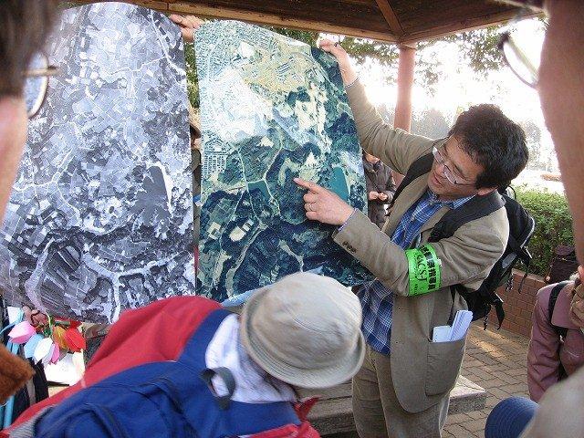 | おまけの話 時間が少し残ったので・・・・昭和42年(1967年)と平成19年(2007年)の航空写真を比較しながら40年の変化を参加者全員が、興味深く 熱心に聞き入っていました。公園の周りの森が少なくなっていることに愕然としていたのも印象的でした。樹木を測り、触れて対話した後だけに各自考えたことも多かったことと思います |