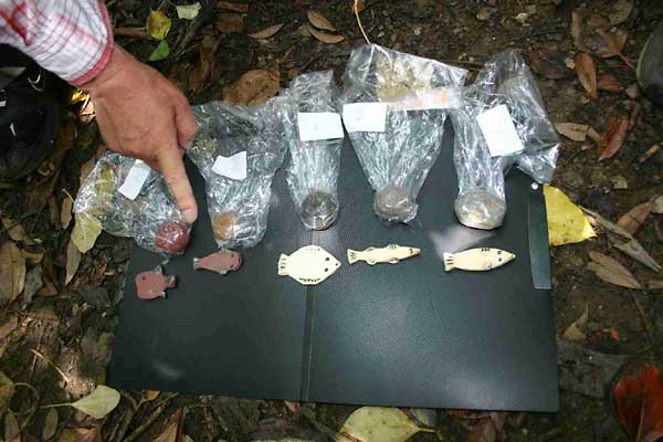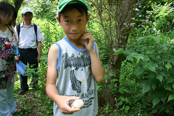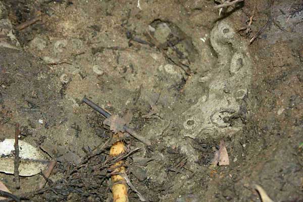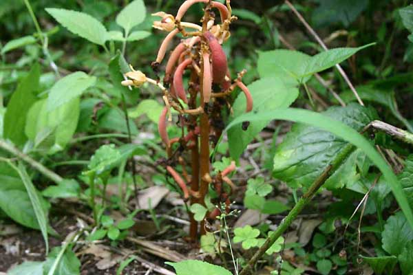 ウインナーソーセージ? 貝がらの近くで珍しいツチアケビが実をつけていた。 |