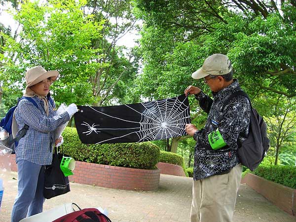 | クモは「気味が悪い」とか「怖い!」と思われがちな生き物であるだけになかなかじっくり観察する機会がありません。今回は、そのクモを取り上げ楽しく観察してもらおうとクモの巣グッズ(上着・手袋・手ぬぐい・ストラップ・傘・靴下などなど)に身を固めた和仁指導員が登場!! 夏休みだったので子ども連れの家族が多く、子どもたちを主体にクモを探しては、観察・実験を繰り返し 楽しみながらの観察会になりました。最後に 「ここでの楽しかった観察をもとにたっぷりある夏休みを自然観察に充てたい」という子や「自由研究に生かしたい」という感想も出され クモに興味をもち 身近に感じてもらえたようでした。 |