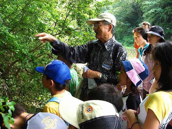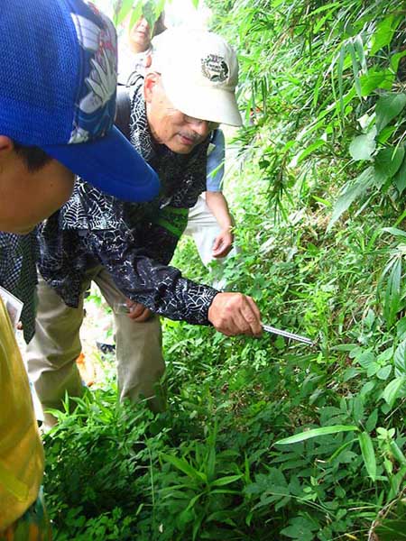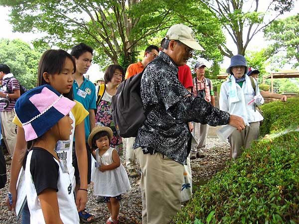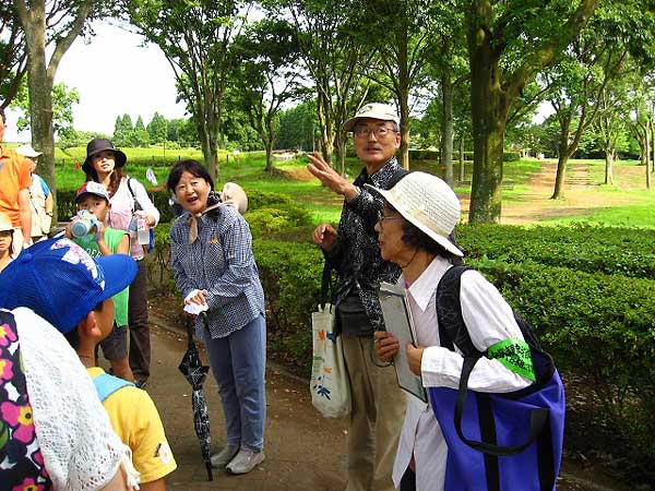 観察会の振り返りで参加者たちと感想を話し合う指導員 |