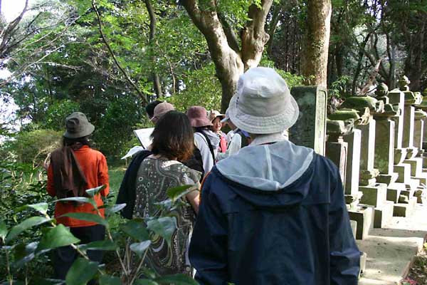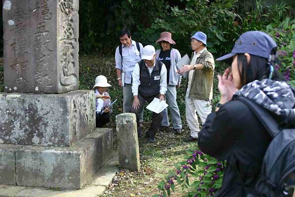 善勝寺境内墓石の後ろは急で深い堀、昔は空堀、土塁に囲まれた砦でもあったとの説明に覗き込む参加者。 |