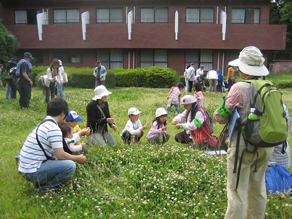 四班に分かれて行動開始。広場で草花や昆虫の観察し草花あそびも楽しむ |