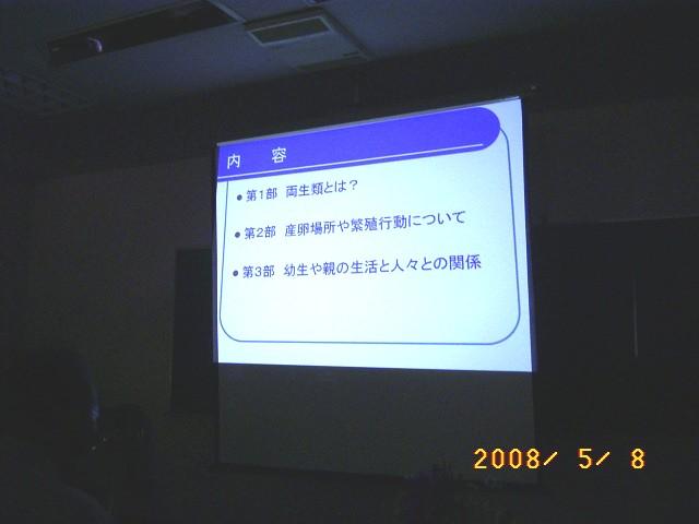 | ゲンジボタル愛護会では、ホタルだけでなくトウキョウサンショウウオの生息できる自然環境の保護、保全にも努めています。スローライフの生きた化石・トウキョウサンショウウオについて、その生息環境や生活について研修し今後の活動に活かすため本研修会が開催されました。 講師の成田篤彦氏は永年にわたり房総半島のトウキョウサンショウウオについて調査、研究をなさっており、その貴重な調査研究結果や写真などパワーポイントを使用して解説していただきました。房総での奇妙な分布と、幼生や親の生活、人間との関係などについて、研究のエピソードをまじえて大変解り易い講義を受け、大いに研鑽を積むことができました。 |