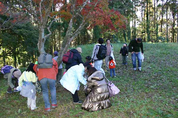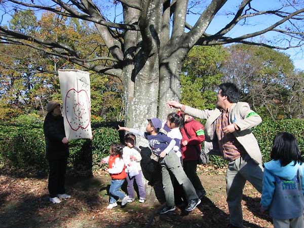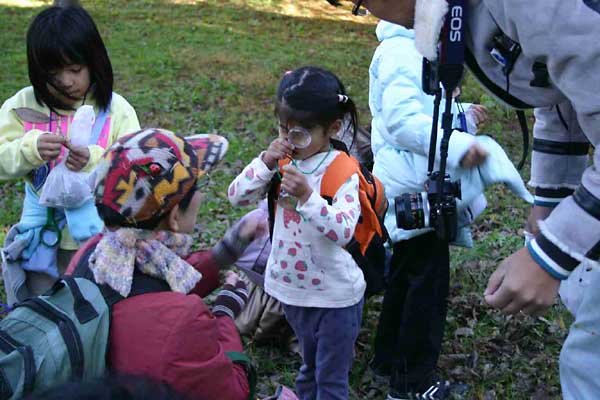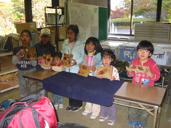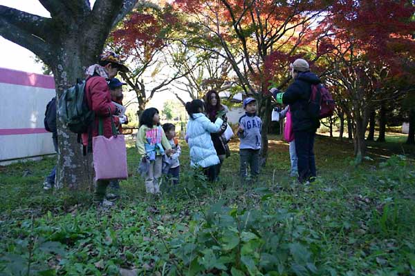 | 秋深まり暦は「小雪」、寒い朝も太陽の広場にはあたたかな陽射しがいっぱい、元気にタネの不思議発見と木の実で工作の観察会がスタートしました。 ケヤキ、キリ、カツラ、イロハモミジ、ガガイモ、オナモミ、イノコズチ、チカラシバ、チヂミザサ、ルーペで見るタネの姿は様々、子孫をのこす仕掛けにびっくり、飛ばしたり、体にくっつけたり次から次へ不思議発見がつづきました。空は雲ひとつなく、錦織りなす紅葉の輝きは見事、写真を撮るとカメラを取り出す子、どんぐり探しに夢中な子、落ち葉じゅうたんを楽しむ子、アッとういう間に時は経ち、ふりかえりをして昼食となりました。 午後の屋外プログラムはどんぐりゴマ作りとオナモミダーツで終了し、恒例の表彰式、後藤指導員より田島和哉君に「昭和の森自然博士」認定証が授与されました。 続いて事務所会議室で、木の実でテントウムシ(トチの実)、イモムシ(どんぐりの殻斗)など作り、思い思いの色を塗り、額縁に貼り付けて完成し全日程が終了、素敵な作品をお土産に、春の子ども観察会の再開を約束しあって解散となりました。(アンケート:楽しかった!特にどんぐり拾い(遊び)と工作。また参加したい!と多数ありました) |