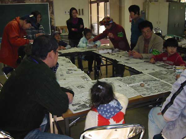 午前中のふりかえり。風に運ばれるもの、動物に運ばれるもの、自分ではじけるものなど、観察したものを発表し、木も草も子孫をのこすために様々な工夫をしていることのおさらいをしました。 |