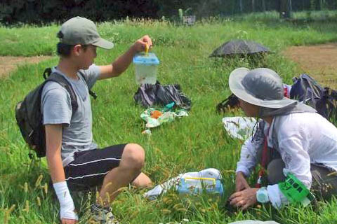 指導員も夢中で虫をゲットして、図鑑で調べたり〜 |
