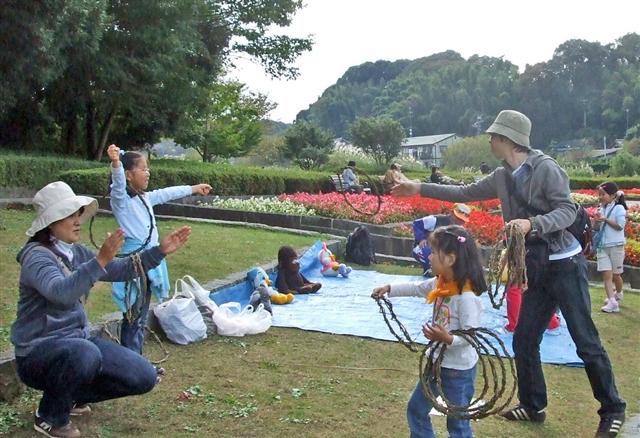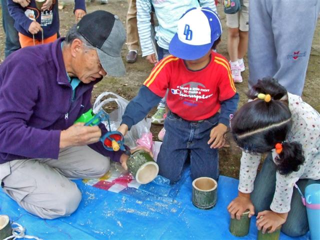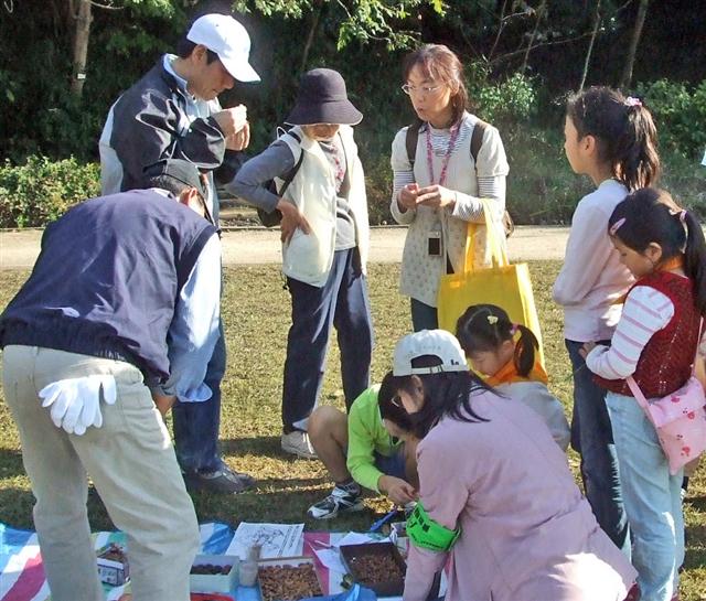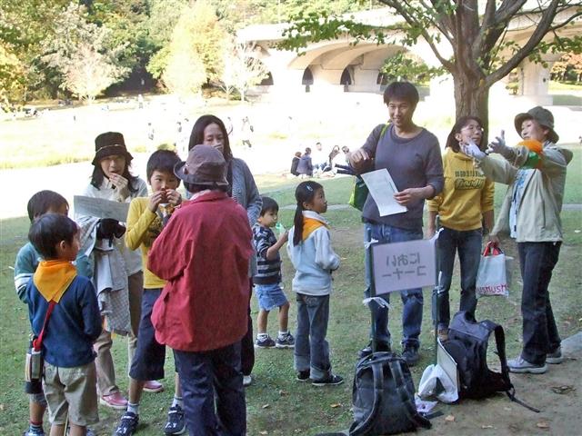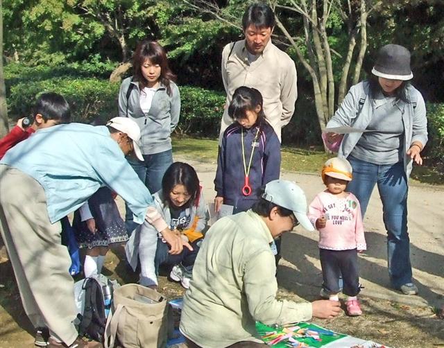 | 爽やかな秋晴れの下で色づき始めた紅葉を愛でながら、50haの自然豊かな公園でスタンプラリーを行いました。今回は「ちばコープ自然くらぶ」との共催で、五感(見る、聞く、嗅ぐ、味わう、触れる)を使って親子で楽しく遊びながら自然を探られる企画でした。@味見コーナー、A野草観察、Bにおい探し、Cひっつき虫、Dササ舟、E秋の歌、F飛ぶタネの7ヶ所のスタンプです。お遊びに:オナモミダーツ・クズの輪投げ・ドングリドンジャラ・ドングリパックで楽しみ、ゴールでは竹ぽっくり・ジュズダマネックレス・どんぐりクラフトを楽しんでもらいました。企画がいっぱいありました。 |