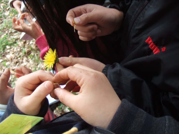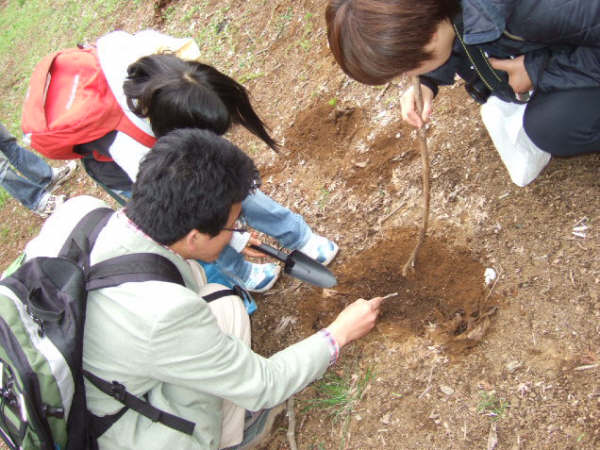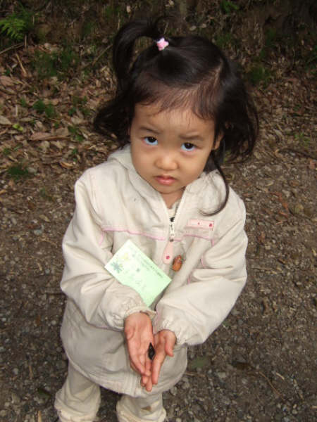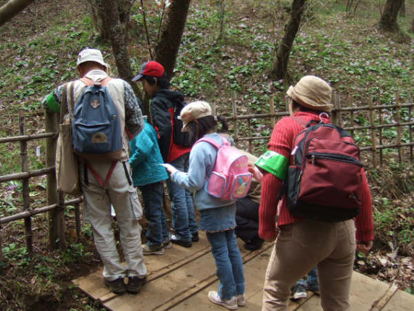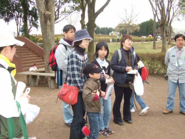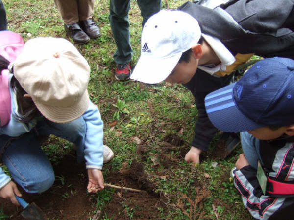 | 桜の花が開花し、昭和の森は春真っ盛り。明るい清々しい日差しの下、色とりどりに咲く草花に誘われて、子どもたちも虫たちも心うきうき。スミレやタンポポの形や匂いや味などを体全体で確かめ、色見本帳を使って、色調べもしました。小さな子どもたちもお父さんやお母さんと一緒になって夢中になっていました。自然界には、何とたくさんの色があるのでしょう。カエルやオタマジャクシ、サワガニなどはやさしく触って、生きている実感を味わいました。モグラの穴探しをしました。柔らかく真新しい土が盛り上がっているところを掘ってみると、「あった!!」子どもも大人も、穴を見つけると歓声を上げていました。モグラがミミズなどのえさを求めてトンネルをつくっていくことが楽しく、長い枝を差し込んで、穴の長さをはかったりしました。19人の子どもたち、年齢差がありましたが、どの子も、意欲的に自然に触れ、たくさんの生き物や草花に接したことがとてもうれしく、楽しい観察会になりました。子どもたちの生き生きとした表情が心に残りました。 | |