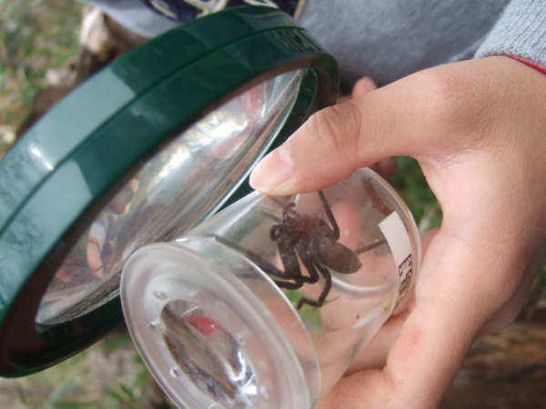 大きなクモだね。クモの目はどこについているかわかる?虫眼鏡で見てごらん。 |