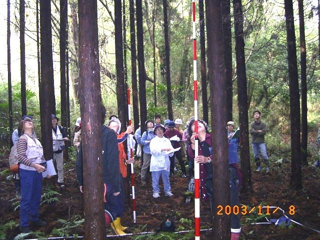 | 研修会では、杉林に群落調査範囲を設定し、下層調査票・木本種調査票等に従い植物調査の実習を行った。また、植生図作成のための植生群調査の第一歩である地図の読み方・地図上での現地の確定等について現場で実習した。その後、植生調査票に従い地形の特徴のスケッチ、階層構造毎の主な優占種・高さ・植被率等群落の記載を尾崎講師の指導の下各自行い、研修会を終えた。 本研修会を植生調査手法習得の第一歩とし、更なる研鑽を積み今後の活動に役立てたい。 |