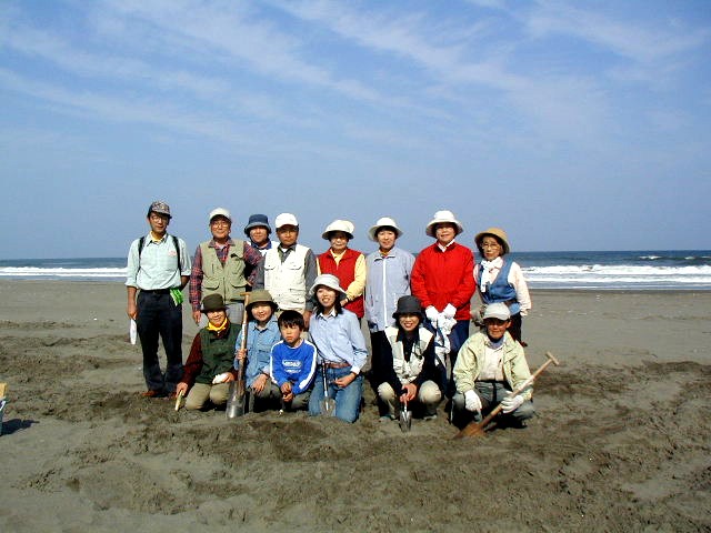 | 昼食前の一仕事は各人が決められた区画の中の漂着物や貝殻を拾うビーチクリーニングです。 流木や沢山の漂着物があるかと思っていたら以外にきれいでした。地元のボランティアの方々が定期的に清掃をして下さっているそうです。 昼食後、拾い集めたゴミや貝殻類の分別を行いました。貝も色々あり名前が気になる「ウバガイ」、食べられる「チョウセンハマグリ」、器になりそうな「イタヤガイ」、獰猛な「ツメタガイ」、素敵な名前の「ワスレガイ」、アートネイルになりそうな「フジノハナガイ」、内側がきれいな「ムラサキイカイ」等を仕分けしました。ゴミの方は、缶、ペットボトル、魚の死骸、軍手等どれも人間が捨てたものばかりで何とも情けないことです。 少し気をつければだれにでも出来ることなのに・・・。 自然を大切にしなければと改めて思いました。(計量記録を付けて町にゴミ収集を依頼。) 「行く春や小貝はどれも淡きいろ」 最後は「クジラ」探しでした。昨年、宮本先生が漂着した小型クジラ「スナメリ」の死骸を標本にするために埋めた物の掘り出しです。記録用紙から推定出来る砂浜をみんなで堀起こしてはみましたが発見出来ません。位置や深さを替えて砂堀を行いましたが気配も感じられず、残念ですが今回は終了にしました。潮風を受けながらの楽しく有意義な海浜研修会を無事終了いたしました。 |