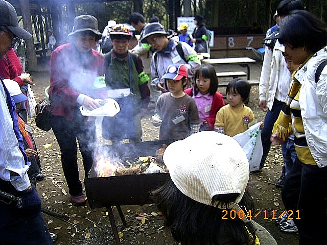 | 紅葉の仕組み・樹形の観察・葉っぱのカルタ・香りのする葉っぱ・鳥の声を聴く・ドングリのコマ作りなど五感を使ってのびのびと出来たように思いました。 最後にした焼き藷作りが一番人気のようでした。ホイルでお藷を包み熾火にのせ、拾ってきた落ち葉をかぶせて出来上がった焼き藷は格別美味しかったようで、昼食後にも拘らず全員完食でした。焼き藷班の方々に心より感謝いたします。 参加者の方々・指導員全員文字どおりおなかも心も秋いっぱいの一日だったように感じました。 |