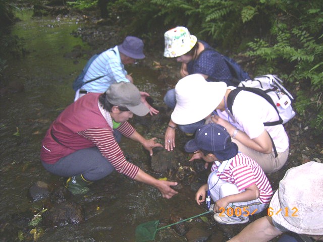 | 梅雨の合間の晴れた青空に恵まれた6月の観察会は、池や川の仲間たちです。中菖蒲田、下夕田池、小中川上流を観察ポイントに3班に分かれて、川や池の生き物調べ、水質の検査をしました。小中川上流では川に入っての観察です。上流部は鉄分を好むバクテリアの発生で赤く染まっています。この川にどんな生き物がいるのでしょう! 手に、手に網を持って、流れの中、流れの淵、石の下と生き物調査です。 「いた、いた」、「見つけた」と子供たちの歓声が上がります。清流に生きるヒガシカワトンボを見つけた男の子、石の下で大きなサワガニを見つけた女の子。 |