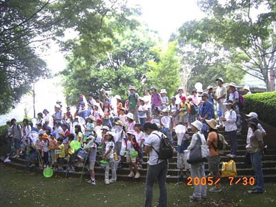 | 午前中は曇り空で、ぎらぎらした夏の太陽は雲に隠れていましたが、集まってくる子どもたちの顔は夏真っ盛り。虫かごを首にぶら下げ、捕虫網を右手に握りしめ、「今日は何匹つかまえられるかな」と期待に胸ふくらませていました。 指導員からの一通りの説明が終わると、いよいよ班にわかれてのトンボ観察に出発。慎重に網をトンボに近づける子ども、トンボがいるやあたりかまわず網を振り回す子ども、絶対オニヤンマをつかまえるんだと鼻息あらく追いかけ回す子ども、かと思えばイトトンボの優美な姿に魅了さている子ども。 |