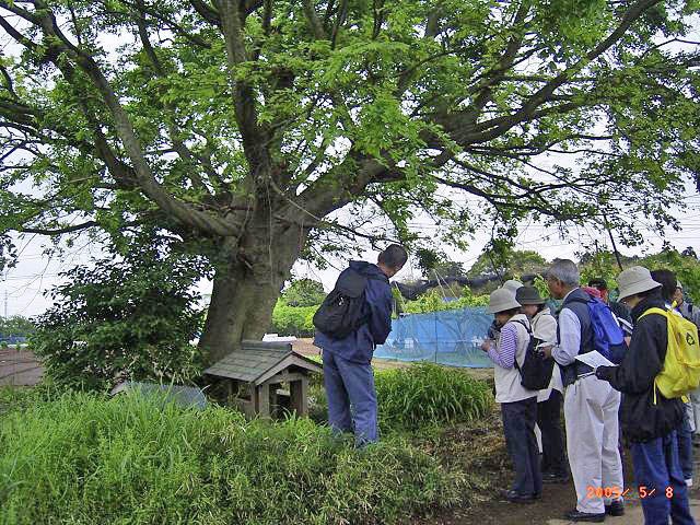 | 道祖神の側に植えられたエノキは、四方に広げた枝振りを見上げ、その下で休んだ旅人の姿を思い浮かべる。ヤブカラシの語源に、うちの庭にも生えてきて困っていると話す人。やさしい色のジュウニヒトエに出会ったり、ハンショウズルを見つけた班もある。鈴身川沿いの水田は田植えが終わり、そののどかな里山の風景にうっとり。 |