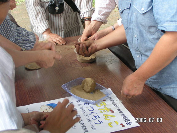 | 小さい子供達から童心に返ってお父さん、お母さんまでが“どろだんご”づくりに熱中した楽しい観察会でした。 |