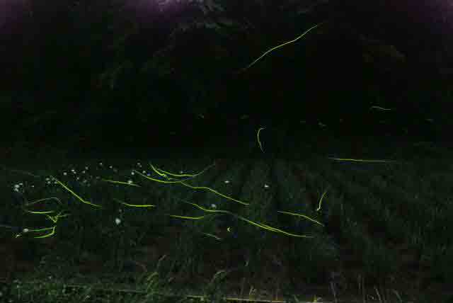 19時22分 アッホタル! お子さんの声に歓声が続く、どこからか口ずさむ歌も聞こえてきました、“柳おぼろに夕やみ寄せて 川のメダカが夢見る頃は ほ、ほ、ホタルが灯をともす”。 |