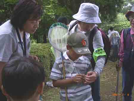 | 今回の観察会では、2歳〜小学生の子どもが参加者の約半数を占めたので、捕虫網を使って自分たちの手でトンボを捕り、じっくり観察できるようにしました。一匹ずつ捕まえて、周りの大人達と一緒に観察して、翅の使い方がチョウと違うこと、翅を休めた姿、オスとメスの違い、胸の縞模様、目の位置の違い、脚の使い方などいろいろなことがわかったようでした。 当日は、オニヤンマも含めて、13種類のトンボを確認することができました。大人は童心に返り、子どもはトンボを身近に思えた1日でした。 当日確認できたトンボ:オニヤンマ,ノシメトンボ,コノシメトンボ,ナツアカネ,マイコアカネ,シオカラトンボ,オオシオカラトンボ,ショウジョウトンボ,コシアキトンボ,チョウトンボ,ハグロトンボ,アオモンイトトンボ,オオアオイトトンボ |