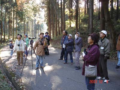 | 今回のテーマとなったルリビタキ(青い鳥)とジョウビタキ(赤い鳥)もここ昭和の森自然公園においては、そんな冬のバードウォッチングで出会うことのできる代表的な鳥たちです。 鳴き声から、必ずこの広い公園の中にいることはわかっているのですが、今回はその姿を見つけられなかったルリビタキ。右はそんなルリビタキが好むやや薄暗い斜面林で、参加者の皆さんが全員耳を澄ませて鳴き声を捉えようとしている場面です。 |