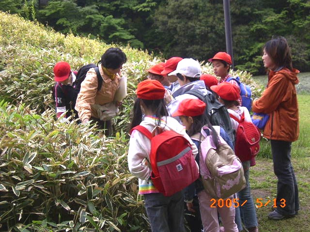 | 「おはようございます!」明るく元気な声が昭和の森、下夕田池周辺に響きわたった。千葉市立大椎小学校4年生132名の自然観察会の始まりです。大椎小学校では4年生の総合学習の一環として、昭和の森の自然を調べる活動を展開しています。自然を観察し、自らテーマを探し、自ら解決する。今回の自然観察会はその導入編として行われ、われわれ指導員はそのお手伝いをさせてもらいました。自然に親しみ、自然が好きになり、自然を大切にする心を育む。充実した内容の総合学習を通じて、豊かな感性を持つ子どもに成長してくれることでしょう。観察会での生徒さんたちの輝いた目に接し、それを確信したのは私だけではないと思います。 | |
