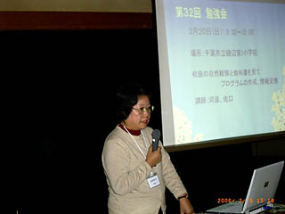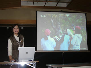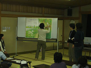 ![]() 「小学校の教科書に出てくる自然」について報告する SSSN担当佐口氏 |